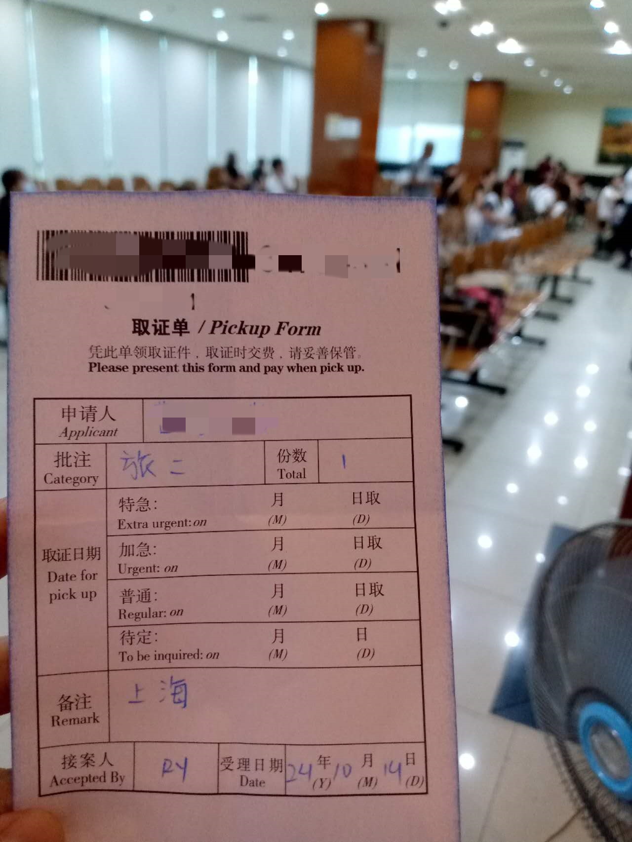 昨天订了昨天晚上凌晨的机票,十一点急急忙忙德找他们办理加急ECC,然后去按指纹,下午五点跟我们说出了,六点邮寄过来给我,幸好还是来的及,真是惊险刺激一天,还是挺靠谱的。